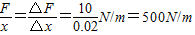 解答:解:弹簧的形变量变化了2cm,弹力变化了10N,根据胡克定律得,k=