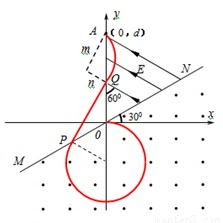 (12分)如图所示,在xoy平面内,直线MN与x轴正方向成30o角,MN下方是垂直于纸面向外的匀强磁场,MN与y轴正方向间存在电场强度E=