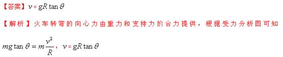 在火车转弯处,外轨略高于内轨,使路面向圆心一侧倾斜一个很小的角度 θ.设拐弯路段是半径为R的圆弧,要使车轮与轨道之间无侧向压力,则火车经过弯道的速度