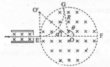 右图中左边有一对平行金属板,两板相距为d,电压为V;两板之间有匀强磁场,磁感应强度大小为B0,方向与金属板面平行并垂直于纸面朝里,图中右边有一半径为R、圆心为O的圆形区域,区域内也存在匀强磁场,磁感应强度大小为B,方向垂直于纸面朝里。一电荷量为q的正离子沿平行于金属板面、垂直于磁场的方向射入平行金属板之间,沿同一方向射出平行金属板之间的区域,并沿直径EF方向射入磁场区域,最后从圆形区域边界上的G点射出,已知弧