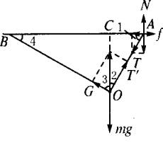 对A处的环有:μN=Tcos∠1①N=Tsin∠1② 由①②得tan∠1= 过O作AB的垂线,则AC=OAcos∠1=30× 从而BC=(50-18)cm=32cm,tan∠4= (1)对O处物体,有T′=mgcos∠2=mgsin∠1=0.8mg=8N,即长30cm的细线的张力为8N. (2)绳将要滑动时,由上分析知:G=mgsin∠2=0.6kg. (3)由上分析知:∠4=90°. 答案:(1)8N (2)0.6kg (3)90° 引申:在图示情景下,设O处重物质量为m1,重物G的质量为m2,要维持各物的位置均不变,则m2的质量增加m时,m1的质量至少增加多少? 小结:力是矢量,其运算方法满足平行四边形法则和正交分解法则.计算求解时,要先作好图示,然后充分利用几何关系求解.