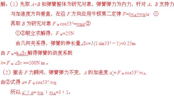 如图所示,A、B两滑环分别套在间距为1m的光滑细杆上,A和B的质量之比为1∶3,用一自然长度为1m的轻弹簧将两环相连,在 A环上作用一沿杆方向的、大小为20N的拉力F,当两环都沿杆以相同的加速度a运动时,弹簧与杆夹角为53°。(cos53°=0.6)