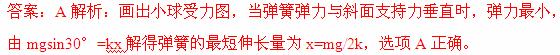 (2013兰州一中月考) 如下图所示,质量为m的小球置于倾角为30°的光滑斜面上,劲度系数为k的轻弹簧一端系在小球上,另一端拴在墙上P点,开始时弹簧与竖直方向的夹角为θ,现将P点沿着墙向下移动,则弹簧的最短伸长量为( )