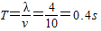 【答案】分析:根据t=0时刻这列波的波形图和该波向右传播可以判定a点向下振动,然后根据波速、波长、周期之间关系,求出周期即可.