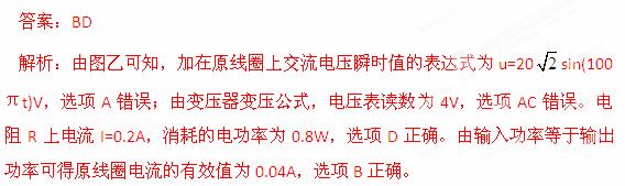 A.加在原线圈上交流电压瞬时值的表达式为u=20