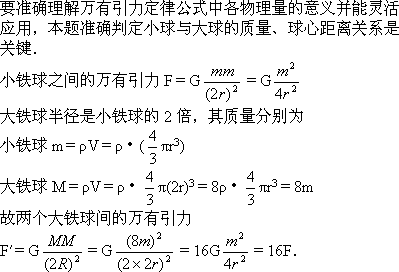 两个质量大小相等的实心小铁球紧靠在一起,它们之间的万有引力为F,若两个半径是小铁球2倍的实心大铁球紧靠在一起,则它们之间的万有引力为