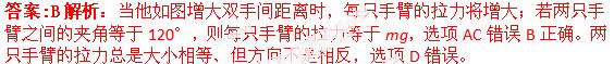 每只手臂的拉力可能等于mg