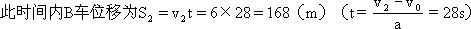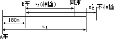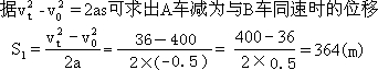 ΔS=364-168=196>180(m) 所以两车相撞. 小结:分析追击问题应把两物体的位置关系图画好.如上图,通过此图理解物理情景.本题也可以借图像帮助理解下图中.阴影区是A车比B车多通过的最多距离,这段距离若能大于两车初始时刻的距离则两车必相撞.小于、等于则不相撞.从图中也可以看出A车速度成为零时,不是A车比B车多走距离最多的时刻,因此不能作为临界条件分析.