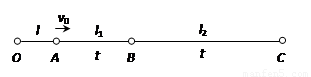 (10分)已知O、A、B、C为同一直线上的四点、AB间的距离为l1,BC间的距离为l2,一物体自O点由静止出发,沿此直线做匀加速运动,依次经过A、B、C三点,已知物体通过AB段与BC段所用的时间相等。
