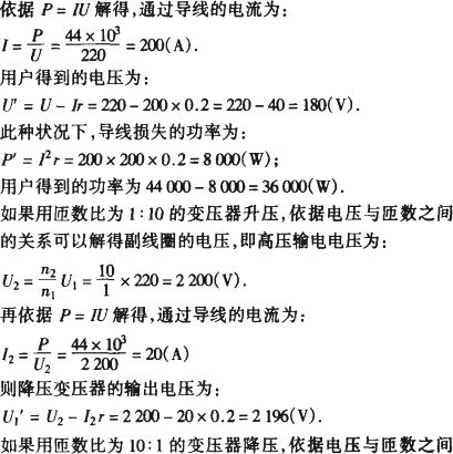 发电机的路端电压为220 V,输送功率为44 kW,输电线电阻为0.2 Ω,则用户得到的电压为________,用户得到的功率为________;如果用原、副线圈匝数之比为1∶10的变压器升压,经同样的输电线后,再用原、副线圈匝数之比为10∶1的变压器供给用户,则用户得到的电压为________,得到的功率为________.