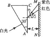 如图所示,横截面积是直角三角形ABC的三棱镜对红光的折射率为n1,对紫光的折射率为n2,一束很细的白光由棱镜的一个侧面AB垂直入射,从另一个侧面AC折射出来.已知棱镜顶角∠A=30°,AC边平行于光屏MN,且与光屏的距离为L.![]()