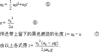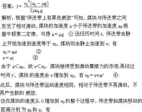 一水平的浅色长传送带上放置一煤块(可视为质点),煤块与传送带之间的动摩擦因数为μ.初始时,传送带与煤块都是静止的.现让传送带以恒定的加速度a0开始运动,当其速度达到v0后,便以此速度做匀速运动.经过一段时间,煤块在传送带上留下了一段黑色痕迹后,煤块相对于传送带不再滑动.求此黑色痕迹的长度.