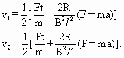 E=B 回路中的电流I=E/2R, 杆甲的运动方程 F-BIl=ma, 由于作用于杆甲、乙的安培力总是大小相等、方向相反,所以两杆的动量等于外力F的冲量 Ft=mv1+mv2, 联立以上各式解得