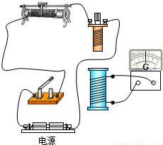 【答案】分析:注意该实验中有两个回路,一是电源、电键、变阻器、小螺线管串联成的回路,二是电流计与大螺线管串联成的回路,据此可正确解答.