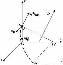 (2)撤去磁场后,带电质点受到重力mg和电场力qEmin作用,其合力沿PM方向并与v方向垂直,大小等于qvB=