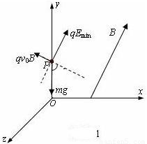 【答案】分析:(1)带电质点受到重力mg(大小及方向均已知)、洛伦兹力qvB(方向已知)、电场力qE(大小及方向均未知)的作用做匀速直线运动.根据力三角形知识分析可知:当电场力方向与磁场方向相同时,场强有最小值Emin.根据物体的平衡规律列式即可求解;