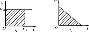 汽车刹车通过的距离可由图象求出来.请大家回忆一下匀速直线运动的速度-时间图象(如图A),图象中阴影部分的面积为v0t0,这个面积在数值上正好等于这个做匀速直线运动的物体在0~t0这段时间内的位移,由此我们联想到做变速直线运动的物体的速度-时间图象中(如图B)阴影部分的面积也等于在这段时间内的位移. 以后我们学习了匀变速直线运动的定量规律后,会很容易得到这个结论.