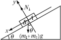 x:(m1+m2)gsin y:N1-(m1+m2)gcos 由①得a=gsin aA=aB=a=gsin 选A、B之中的任一个物体为研究对象,设A、B间的弹力为NAB或(NBA),进行受力分析,建立如图所示的直角坐标系,列方程得