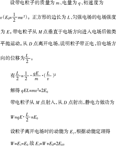 ABCD区域内,M为AB边的中点.一个具有初动能为E0的带电粒子射入电场(沿纸面方向),如果带电粒子从M点垂直于电场方向进入电场后,恰好从D点离开电场.带电粒子重力不计,求:带电粒子从D点离开电场时的动能是多大?|