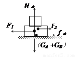 如图所示,在水平面上叠放着两个物体A和B,两物体在F1,F2 (F1>F2)的水平拉力作用下,处于静止状态。试分别画出A物体、B物体和整体的受力图.![]()