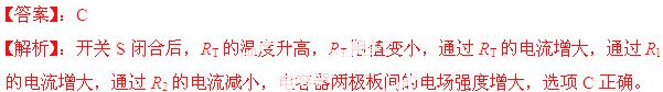 (2013北京西城期末)如图所示,电路中RT为热敏电阻,R1和R2为定值电阻。当温度升高时,RT阻值变小。开关S闭合后,RT的温度升高,则下列物理量中变小的是