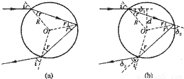 雨过天晴,人们常看到天空中出现彩虹,它是由阳光照射到空中弥漫的水珠上时出现的现象.在说明这个现象时,需要分析光线射入水珠后的光路.一细束光线射入水珠,水珠可视为一个半径为R的球,球心O到入射光线的垂直距离为d,水的折射率为n.(1)在图上画出该束光线射入水珠内经一次反射后又从水珠中射出的光路图