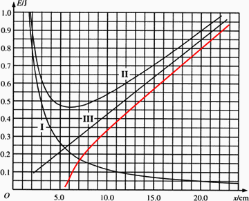 (1)势能最小处动能最大 (1分) 由图线Ⅱ得 (在5.9~6.3 cm间均视为正确) (2)由图读得释放处势能 ( 最大速度为 ( x=20.0 cm处的总能量为0.90 J,最大位移由E=0.90 J的水平直线与曲线Ⅱ的左侧交点确定,由图中读出交点位置为x=2.0 cm,因此,最大位移 ( (3)渐近线Ⅲ表示B的重力势能随位置变化关系,即 ∴ 由图读出直线斜率 ( (4)若异名磁极相对放置,A,B间相互作用势能为负值,总势能如图 (2分)