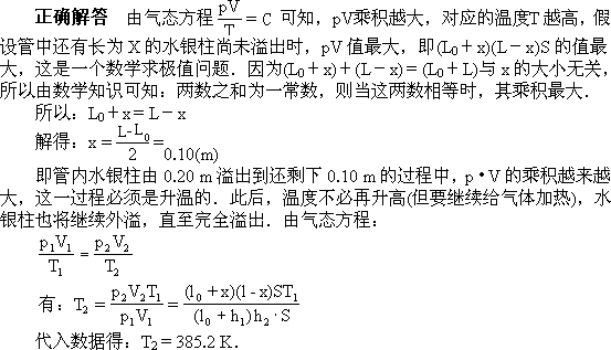 如图所示,一根一端封闭的玻璃管,当L=0.96 m,内有一段长h1=0.20 m的水银柱.当温度为t1=27℃,开口端竖直向上时,封闭空气柱h2=0.60 m.问温度至少升到多高时,水银柱才能从管中全部溢出?(外界大气压相当于L0=0.76 m高的水银柱产生的压强)