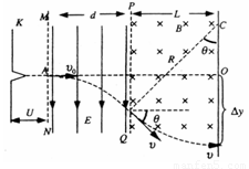 ÈçͼËùʾ£¬KÓëÐéÏßMNÖ®¼äÊǼÓËٵ糡£¬ÐéÏßMNÓëPQÖ®¼äÊÇÔÈÇ¿µç³¡£¬ÐéÏßPQÓëÓ«¹âÆÁÖ®¼äÊÇÔÈÇ¿´Å³¡£¬ÇÒMN¡¢PQÓëÓ«¹âÆÁÈýÕß»¥ÏàÆ½ÐУ¬µç³¡ºÍ´Å³¡µÄ·½ÏòÈçͼËùʾ£¬Í¼ÖÐAµãÓëOµãµÄÁ¬Ïß´¹Ö±ÓÚÓ«¹âÆÁ.Ò»´øÕýµçµÄÁ£×Ó´ÓAµãÀ뿪¼ÓËٵ糡£¬ËÙ¶È·½Ïò´¹Ö±ÓÚÆ«×ªµç³¡·½ÏòÉäÈëÆ«×ªµç³¡£¬ÔÚÀ뿪ƫתµç³¡ºó½øÈëÔÈÇ¿´Å³¡£¬×îºóÇ¡ºÃ´¹Ö±µØ´òÔÚÓ«¹âÆÁÉÏ.ÒÑÖªµç³¡ºÍ´Å³¡ÇøÓòÔÚÊúÖ±·½Ïò×ã¹»³¤£¬¼ÓËٵ糡µçѹÓëÆ«×ªµç³¡µÄ³¡Ç¿¹ØÏµÎªU=