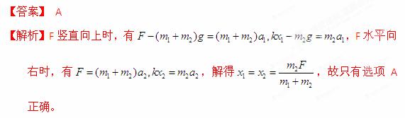 (2013贵州六校联考)a、b两物体的质量分别为m1、m2,由轻质弹簧相连。当用恒力F竖直向上拉着 a,使a、b一起向上做匀加速直线运动时,弹簧伸长量为x1 ;当用大小仍为F的恒力沿水平方向拉着 a,使a、b一起沿光滑水平桌面做匀加速直线运动时,弹簧伸长量为x2,如图所示。则