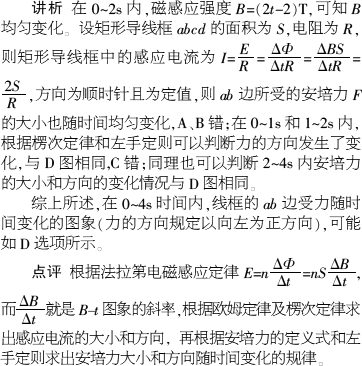 矩形导线框abcd放在匀强磁场中,磁感线方向与线圈平面垂直,磁感应强度B随时间变化的图象如图所示.t=0时刻,磁感应强度的方向垂直于纸面向里.在0~4 s时间内,线框的ab边受力随时间变化的图象(力的方向规定以向左为正方向,如图所示),可能为下列选项中的