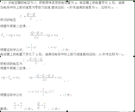 3.现将滑动变阻器的滑片P由中点迅速向上滑到某位置,使电容器上的电荷量变化了Q1,油滴运动时间为t;再将滑片从该位置迅速向下滑动到另一位置,使电容器上的电荷量又变化了Q2,当油滴又运动了2t的时间,恰好回到原来的静止位置.设油滴在运动过程中未与极板接触,滑动变阻器滑动所用的时间与电容器充电、放电所用时间均忽略不计.求:Q1 与Q2的比值.