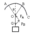 如下图所示,用细绳OA和OB悬挂着一个重物,保持重物的位置不变(图中绳子的结点位于圆心)时,使OB端沿半径等于绳长的圆周轨迹向C移动,在这过程中,OB绳中的张力FB的最小值是____________.