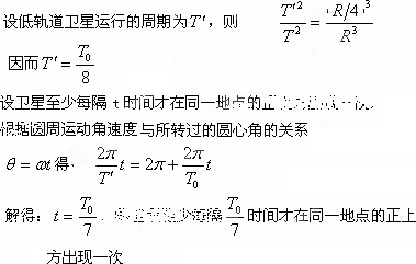 (2)有一颗与上述同步卫星在同一轨道平面的低轨道卫星,自西向东绕地球运行,其运行半径为同步轨道半径R的四分之一,试求该卫星的周期T是多少?该卫星至少每隔多长时间才在同一城市的正上方出现一次.(计算结果只能用题中已知物理量的字母表示)