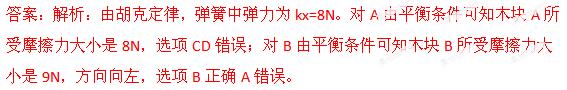 木块A、B分别重50 N和60 N,它们与水平地面之间的动摩擦因数均为0.25 ;夹在A、B之间的轻弹簧被压缩了2 cm,弹簧的劲度系数为400N/m。系统置于水平地面上静止不动。现用F =1N的水平拉力作用在木块B上。如右图所示.力F作用后 ( )![]()