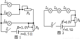 三只灯泡L1、L2和L3的额定电压分别为1.5V、1.5V和2.5V,它们的额定电流都为0.3A.若将它们连接成图1、图2所示电路,且灯泡都能正常发光.(1)试求图1电路的总电流和电阻R2消耗的电功率;