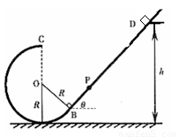 ÈçͼËùʾ£¬Çã½ÇΪ¦È=45¡ãµÄ´Ö²Ú³¤Ö±µ¼¹ìÓë°ë¾¶ ΪRµÄ¹â»¬Ô²»·¹ìµÀÏàÇУ¬ÇеãΪB£¬Õû¸ö¹ìµÀ´¦ÔÚÊúÖ±Æ½ÃæÄÚ¡£Ò»ÖÊÁ¿ÎªmµÄС»¬¿é´Óµ¼¹ìÉÏÀëµØÃæ¸ßΪh=3RµÄD´¦ÎÞ³õËÙÏ»¬½øÈëÔ²»·¹ìµÀ¡£½Ó×ÅС»¬¿é´ÓÔ²»·×î¸ßµãCˮƽ·É³ö£¬Ç¡ºÃ»÷Öе¼¹ìÉÏÓëÔ²ÐÄOµÈ¸ßµÄPµã,²»¼Æ¿ÕÆø×èÁ¦¡£Çó£º