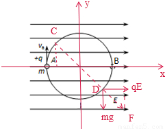 ÓÉqE=mg£®ÓÉÓÚÇòÖ»Êܵ½ÖØÁ¦ºÍµç³¡Á¦µÄ×÷Ó㬲¢ÇÒÖØÁ¦ºÍµç³¡Á¦µÄ´óСÏàµÈ£¬µ±Á½¸öÁ¦µÄºÏÁ¦Ñذ뾶ÏòÍâʱ£¬ÈçͼËùʾ¾¹ýDµãʱ£¬¶¯ÄÜ×î´ó£¬»·¶ÔÇòµÄ×÷ÓÃÁ¦×î´ó£¬´ËʱCDÓëÊúÖ±·½ÏòµÄ¼Ð½ÇΪ45°£¬¸ù¾Ý¶¯Äܶ¨ÀíµÃ£º