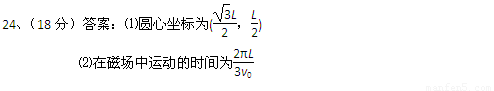 (18分)如图所示,在平面直角坐标系中有一个垂直于纸面向里的圆形匀强磁场,其边界过原点O和y轴上的点a(0,L)。 一质量为m、电荷量为e的电子从a点以初速度v0平行于x轴正方向射入磁场,并从x轴上的b点射出磁场,此时速度方向与x轴正方向的夹角为60°。求: