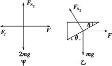 利用整体法对AB受力分析如图甲, 则F=Ff=2μmg① 对物体B受力分析如图乙 则Fcos 由①②得μ=