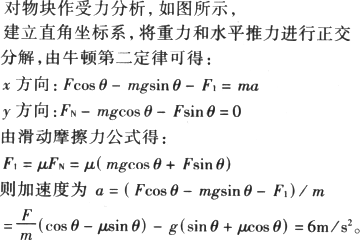 如图所示,质量m=1 kg的小物块M放在倾角为θ=37°的斜面上,物块跟斜面间的动摩擦因数μ=0.2.现用大小为F=20 N的水平推力作用于物块,则其上滑加速度为多大?(g取10 m/s2,sin37°=0.6)