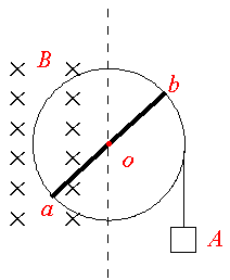 如图,边缘带有槽的均匀金属圆环,电阻为2R,沿其直径装有一根长为2P、电阻为R的金属杆ab,圆环可绕过ab杆中点且与环面垂直的水平轴O转动,在环边缘的槽内绕有一根足够长的轻质绳,绳端拴一质量为m的物体A,圆环的一半处于垂直环面的匀强磁场中,磁感应强度为B。现将物体A由静止释放,若不计一切摩擦,求金属圆环转动中可达到的最大角速度?![]()