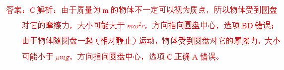 C£®ÎïÌåÊܵ½Ô²Å̶ÔËüµÄĦ²ÁÁ¦£¬´óС¿ÉÄÜСÓÚ¦Ìmg£¬·½ÏòÖ¸ÏòÔ²ÅÌÖÐÐÄ