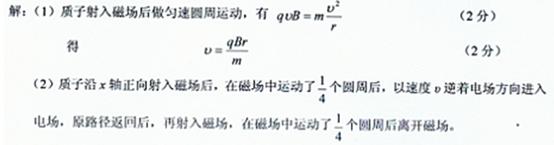 如图所示,在x-o-y坐标系中,以(r,0)为圆心,r为半径的圆形区域内存在匀强磁场,磁场的磁感应强度大小为B,方向垂直于纸面向里。在y>r的足够大的区域内 ,存在沿y轴负方向的匀强电场,场强大小为E。从O点以相同速率向不同方向发射质子,质子的运动轨迹均在纸面内,且质子在磁场中运动的轨迹半径也为r。已知质子的电荷量为q,质量为m,不计质子所受重与及质子间相互作用力的影响。![]()
