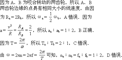 在图中,A、B为咬合转动的两齿轮,Ra=2Rb,则A、B两轮边缘上两点的
