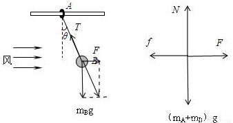 C、D、把环和球当作一个整体,对其受力分析,受重力(mA+mB)g、支持力N、风力F和向左的摩擦力f,如右图