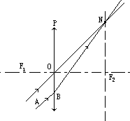入射光线经凸透镜折射后将向主光轴偏折,只有一条入射光线我们只能知道折射光的大概位置,但不能准确地做出折射光线,为了确定折射光线,必须引入辅助线,并且辅助入射光线的折射光应很容易确定.凸透镜成像中,有三条特殊光线:通过光心的光线,经凸透镜折射后传播方向不变;平行于主光轴的光线,经凸透镜折射后,折射光线过焦点;从焦点发出的光,经凸透镜折射后,平行于主光轴.本题主要考查学生对三条特殊光线的灵活运用. [思路一]利用虚物法.设想在入射光AB上有一点光源S,如能做出光源S的像 [思路二]利用焦平面法.位于过焦点且垂直于主光轴的平面(焦平面)上的点光源不能成像,表明光源发出的光经凸透镜折射后的折射光线是平行光,设想入射光线AB上恰有一光源处在左焦平面上,若能确定该光源的一条折射光,则AB的折射光线便可以确定. [思路三]仍利用焦平面法.一束平行光入射到凸透镜后,折射光线必会聚于焦平面上的某一点.设想有一条与AB平行的光线入射到凸透镜上,只要做出其折射光线与右焦平面的交点,即可做出AB的折射光线. [思路四]利用光路可逆性原理.本题要求解AB的折射光线,若能设想有一条入射光从凸透镜的右侧入射,而其折射光线恰好是BA,则此问题便化为求解物点,解决方案又有多种. |