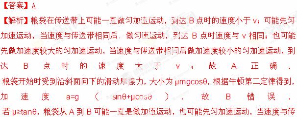 (2013山东济南测试)如图所示为粮袋的传送装置,已知AB间长度为L,传送带与水平方向的夹角为θ,工作时运行速度为v,粮袋与传送带间的动摩擦因数为μ,正常工作时工人在A点将粮袋放到运行中的传送带上,关于粮袋从A到B的运动,以下说法正确的是(设最大静摩擦力等于滑动摩擦力)( )