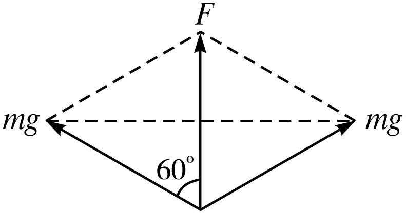 因为是滑轮,所以绳中的拉力都等于物体A的重力mg,由于B物体处于静止状态,说明两绳拉力的合力大小等于B物体的重力. 作出两绳拉力合力的示意图,如下图所示,因为作出的平行四边形为菱形,所以两绳拉力的合力F=2mgcos60°=mg,即物体B的重力为mg,由此得B的质量也为m.