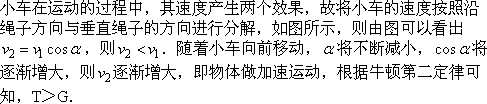 极易犯的错误就是将绳子的速度按水平与竖直两个方向正交分解.正确的解方法是将物体(小车)实际运动的速度分解到沿绳子的方向与垂直与绳子的方向上去. |